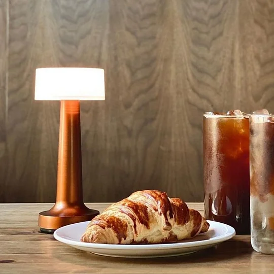 A slim metal-bodied cordless table lamp featuring an enclosed cylindrical diffuser gives maximum direct downlight without glare. Ideal for unobtrusive table lighting and for rooms with views through the glass as there are minimal reflections.